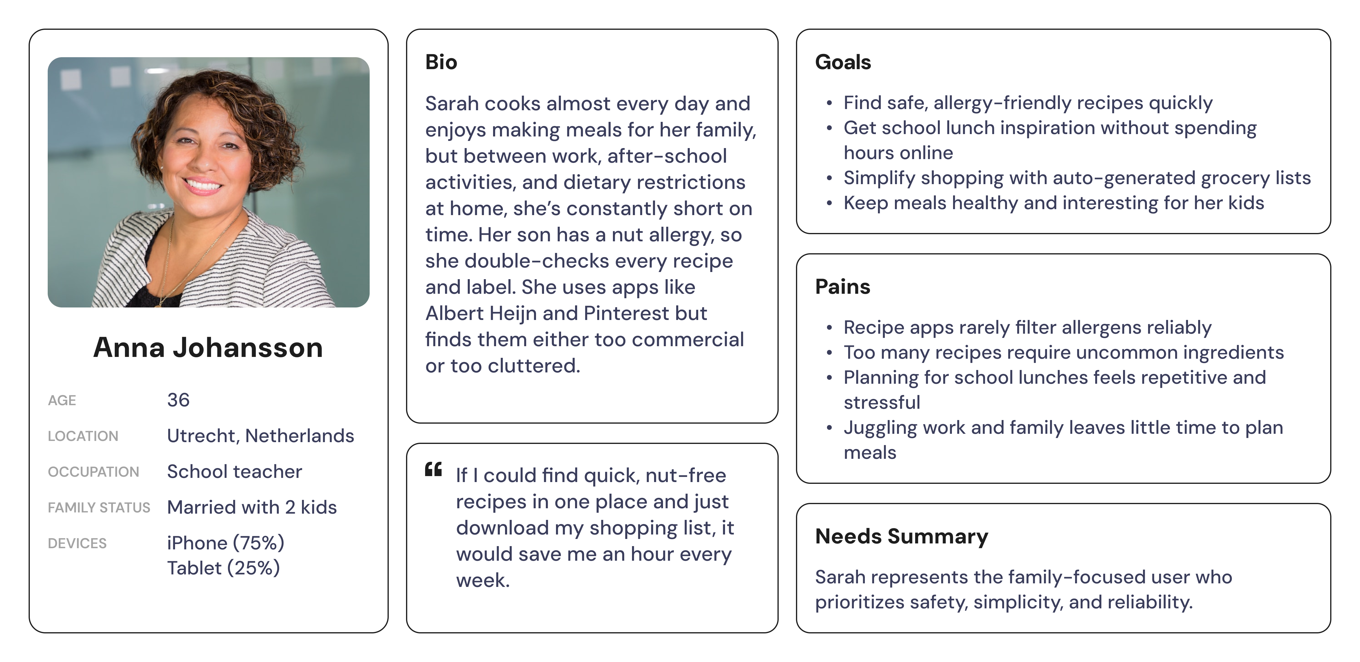 The research phase focused on understanding how different user groups: parents, students, and professionals approach cooking, grocery planning, and dietary management.