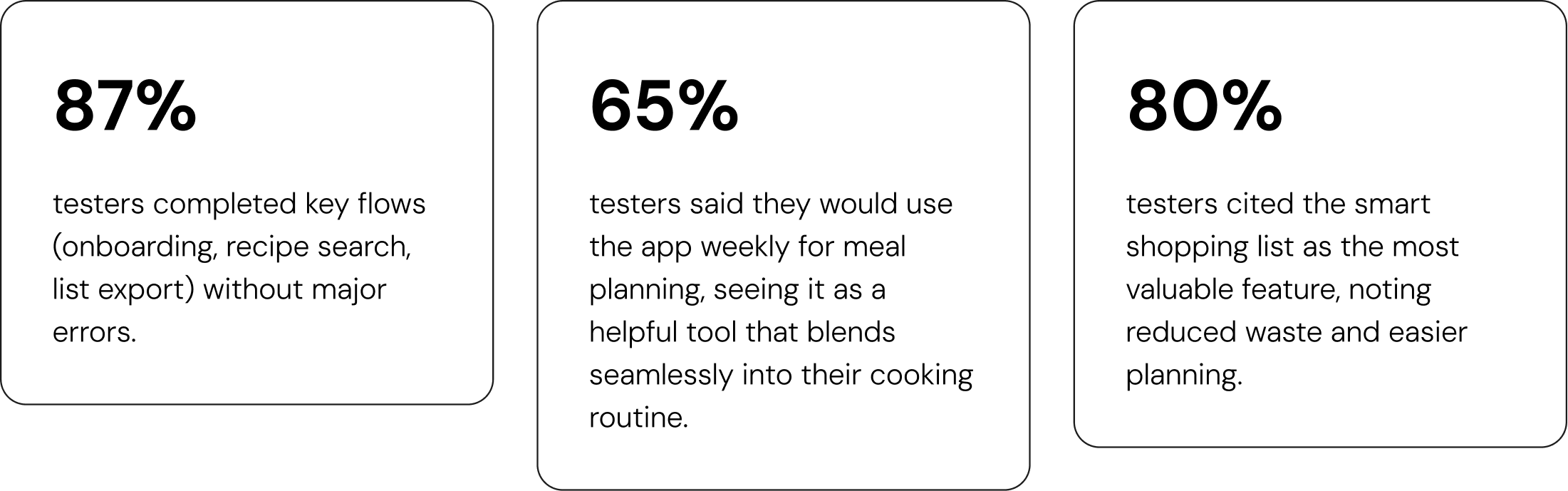The design was validated through remote testing of a Figma prototype using Maze. The goal was to assess how well the concept aligned with user needs and expectations, and how effectively the design worked in practice. Participants responded positively, describing ListoBites as an organized and stress-free way to plan meals. The results confirmed that the visual direction, interaction flow, and overall concept resonated strongly with users, providing a solid foundation for the next development phase.